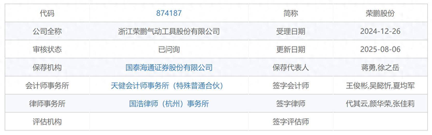 8月6日,据北交所官网,浙江荣鹏气动工具股份有限公司(下称“荣鹏股份”)回复第二轮问询,涉及客户成立前便开始合作、仅与较少主要客户签长期协议等问题。