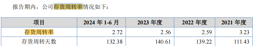 此外,报告期内,该公司的存货周转率呈下降趋势,分别为3.23次、2.59次、2.56次和2.72次,同期存货周转天数分别为111.43天、139.22天、140.61天和132.38天,存货周转天数呈上升趋势。