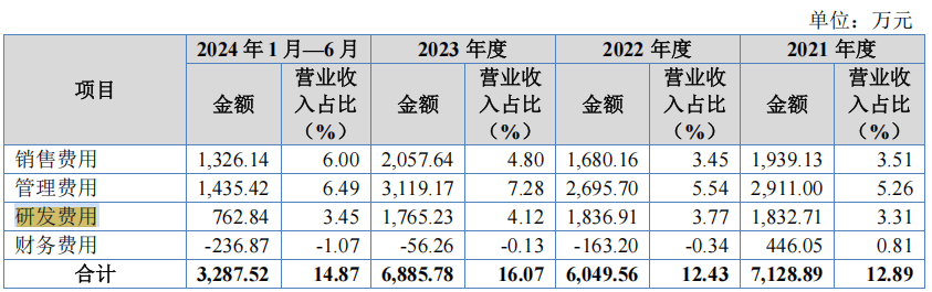 此外,报告期内,荣鹏气动的销售费用总体高于研发费用。报告期内,该公司的销售费用分别为1939.13万元、1680.16万元、2057.64万元和1326.14万元,占当期营业收入的比例分别为3.51%、3.45%、4.8%和6%。