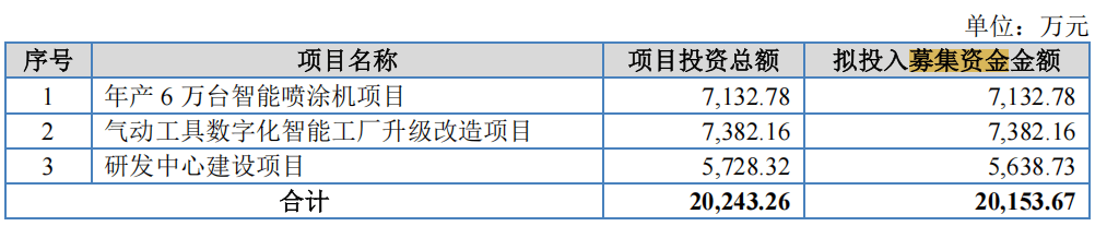 招股书显示,此次IPO,荣鹏股份计划募集资金2亿元,其中0.7亿元用于年产6万台智能喷涂机项目,0.7亿元用于气动工具数字化智能工厂升级改造项目,0.56亿元用于研发中心建设项目。