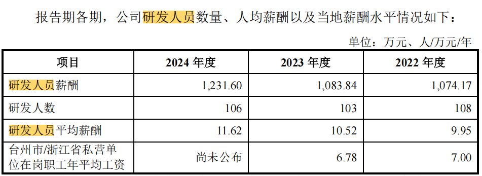 2022年、2023年和2024年,荣鹏气动拥有研发人员分别为108人、103人和106人,同期研发人员的平均薪酬分别为9.95万元、10.52万元和11.62万元。