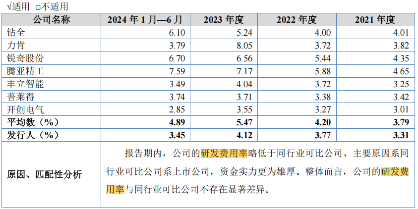 荣鹏气动的研发费用率落后于同行可比公司的均值。报告期内,同行可比公司的研发费用率均值分别为3.79%、4.2%、5.47%和4.89%,高于荣鹏气动的研发费用率。