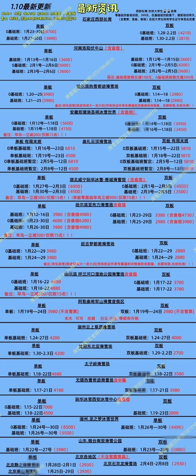 其中提到,根据报考者滑雪水平不同,培训班分为基础班和零基础班,其中单板基础班需要学员掌握基础S弯换刃滑行,双板基础班要求学员掌握平行式转弯。基础班的培训时长多在3-5天,零基础班周期可达到一周,部分培训班可提供周末班,“周末班是4天培训,倒数第二天考理论,最后一天考实操。”